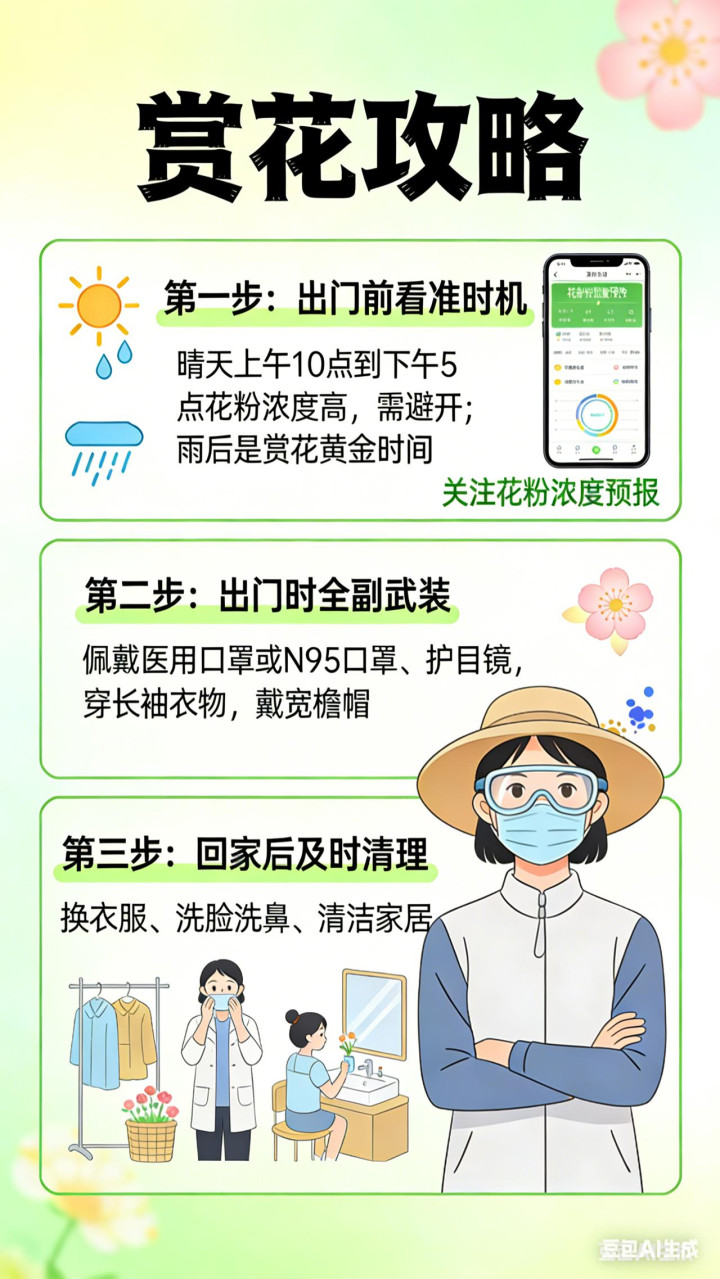 选对技巧:好天时,上昼10点到下昼5点是花粉浓度最高的时段,最佳避让。雨后是外出赏花的黄金技巧,雨水能冲刷掉空气中的花粉,空气最簇新。