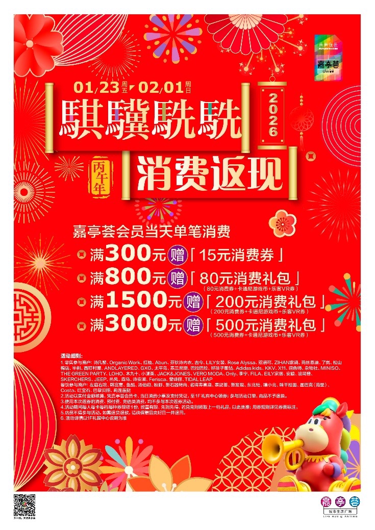骏马奔突启新程,年味氤氲庆新春。2026年丙午马年新春之际,嘉亭荟以“骐骥駪駪·嘉象万荟”为主题,深度交融“文、商、旅、娱”多元场景,将传统年味与潮水元素相结合,悉心打造集游玩、购物、千里浸体验于一体的新春乐土,为市民献上一场兼具文化底蕴与潮水活力的节日盛宴,握续激活区域铺张活力,传递新春温暖。