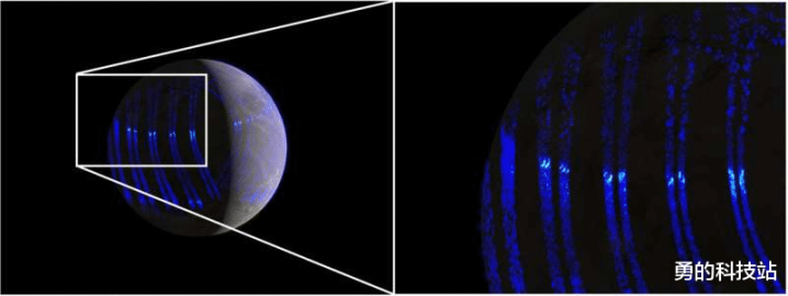 基于朱诺号2021年7月7日近距离不雅测的木卫三紫外极光艺术视图。朱诺号高速掠过木卫三时,紫外光谱仪只可捕捉到细长条带,此处合成透露极光的举座局势(左图)。然而,当放大单个条带(右)时,不错显着发现这极光是由一连串斑块构成,而非均匀的幕布。访佛的极光花式也在地球以及木星、土星等其他行星上被不雅测到,标明六合经由正在起作用。图片开头:NASA