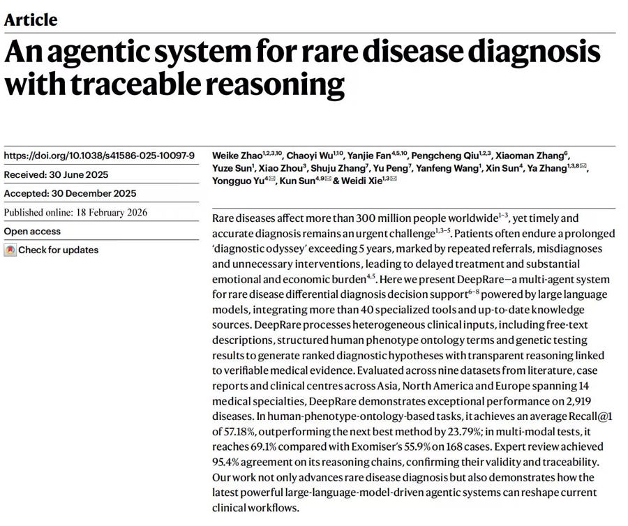 新春佳节之际,中国东谈主工智能与医学交叉限度迎来重磅突破:北京时刻2月19日凌晨,海外顶级学术期刊《当然》(Nature)在线刊发上海交通大学医学院从属新华病院孙锟培植、余永国培植领衔团队与上海交通大学东谈主工智能学院张娅培植、谢伟迪副培植领衔团队推敲商讨戒指。这款民众首个可溯源智能样式残酷病会诊系统DeepRare,凭借开创Agentic AI架构破解残酷病会诊宇宙性难题,会诊精度刷新宇宙记载,其关系专揽已作事民众600余家顶尖医疗科研机构,为民众残酷病患者点亮确诊但愿,也秀美着中国医工交叉鼎新戒指站上宇宙舞台中央。