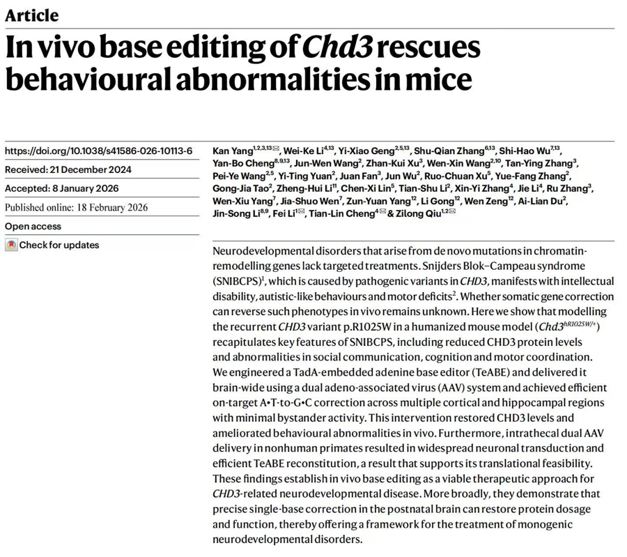 同日,《当然》还在线发表了一项由上海交通大学医学院从属新华病院发育活动儿童保健科及培植部-上海市环境与儿童健康要点推行室培植李斐、副商讨员杨侃团队,与上海交通大学医学院松江商讨院仇子龙培植团队、复旦大学脑科学飘浮商讨院商讨员程田林团队和中国科学院分子细胞科学超卓鼎新中心李劲松院士团队通力融合完成的一项重磅戒指。这项商讨不仅考证了脑内精确基因裁剪的可行性,更让民众神经发育疾病患者家庭看到了颐养的朝阳,为这类疾病的基因颐养带来突破性弘扬。