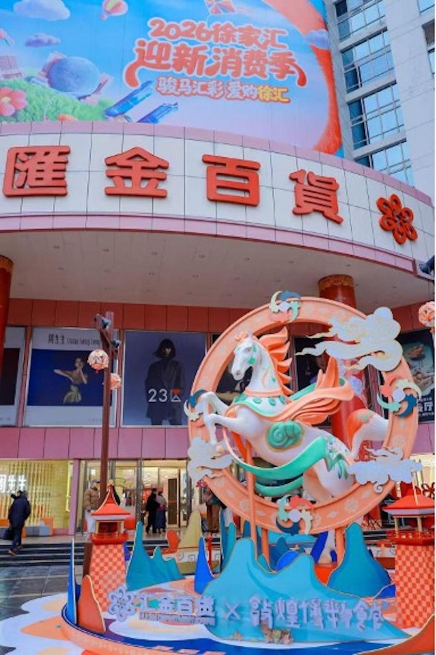 汇金百货的造景与敦煌博物馆跨界和洽,以敦煌壁画中破壁而出的祥瑞神兽“翼马”、敦煌博物馆中代表性的彩色山川、飞天绸带、宫阙剪影、莲花底纹等元素营造境界;