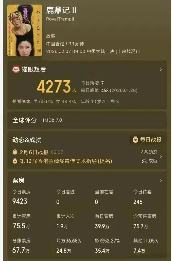 2026年2月7日,周星驰经典《鹿鼎记2:神龙教》4K设立重映,本合计能靠心扉再火一把,后果上映4天总票房才75万,片方分账仅24.8万,连一部小资本网大批不如,数据实在太丢脸。