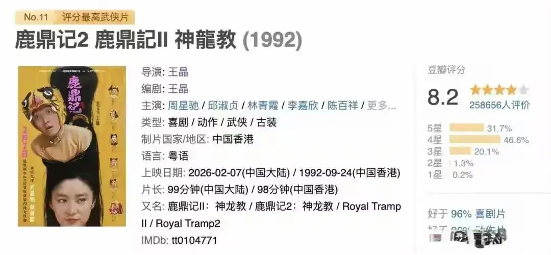 对比之前的重映收成,下滑得更显然:《食神》重映拿了500多万,《鹿鼎记1》128万,到《鹿鼎记2》径直跌破百万,一条断崖式着落的弧线摆在目下,照旧喊着“欠星爷一张电影票”的不雅众,这回真不买单了。