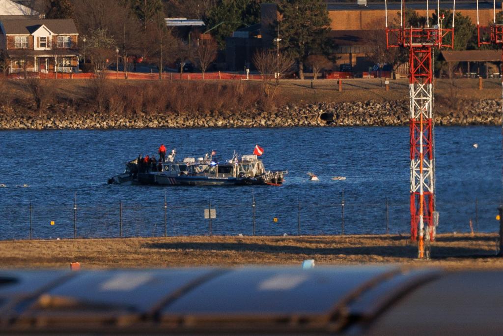 2025年2月1日,职责主说念主员在好意思国华盛顿里根国度机场旁的波托马克河上打捞飞机颓残。新华社发(亚伦摄)