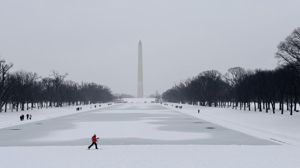 1月25日,东说念主们在好意思国齐门华盛顿林肯缅思堂倒影池旁的雪中行走。新华社记者徐剑梅摄