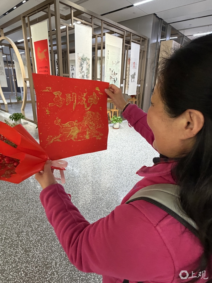 “新年是新的运行,我最气象和书香、书海合股,这等于我家的‘年味’。”家住北蔡的彭女士在六楼上海社科馆体验了年画拓印,一幅黄灿灿的“马到功成”和一把上海老基础底细过年互赠的“老虎柏子花”,她爱不忍释,“笃定要把它们带回家吩咐起来”。