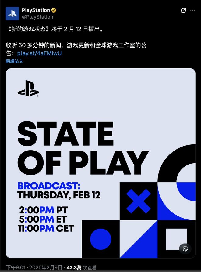 2月9日,索尼PlayStation官圣洁式晓谕,新一期State of Play发布会将于北京时刻2月13日(周四)早上6点举行。这场时长向上60分钟的直播,将成为索尼在2026年的首个迫切游戏展示窗口,展望将带来多量对于PS5平台的第一方、第三方及零丁游戏的最新谍报。
